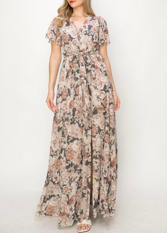 Chiffon Floral Wrap Front Slit Maxi Dress in Mauve