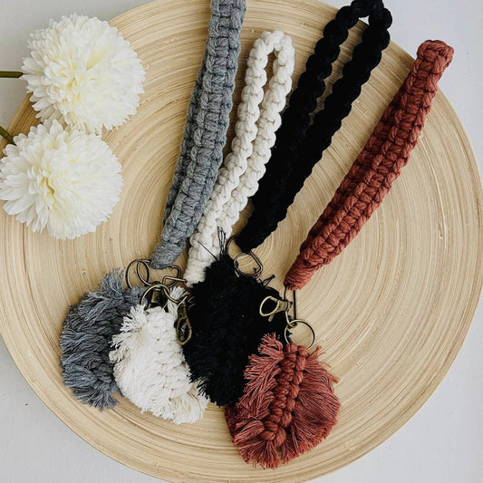 Boho Macrame Keychain - Leaf Tassel - Grey