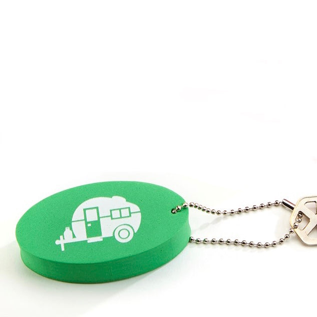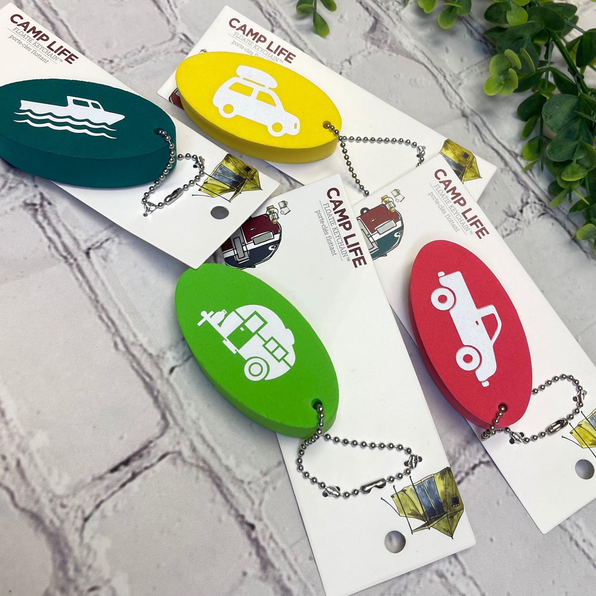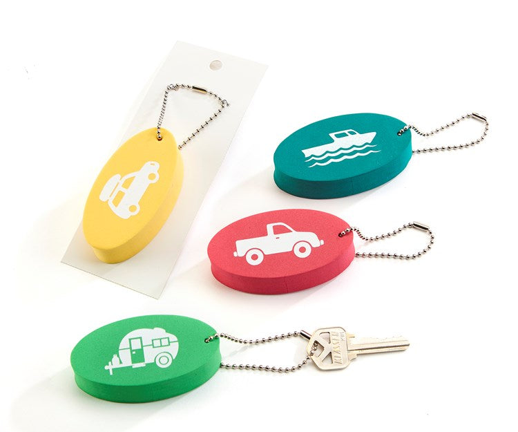 Never lose your keys in the water with this floating key chain. Available in 4 assorted designs: Red/Truck, Green/Trailer, Yellow/SUV, Blue/Boat.