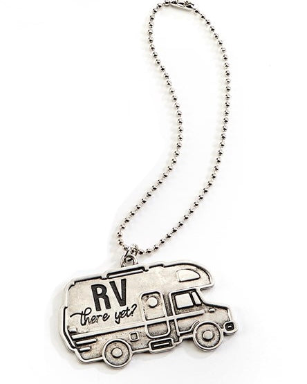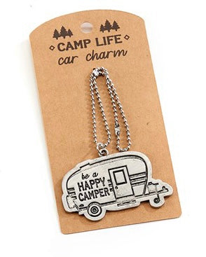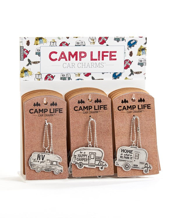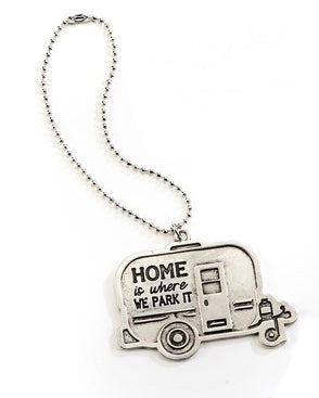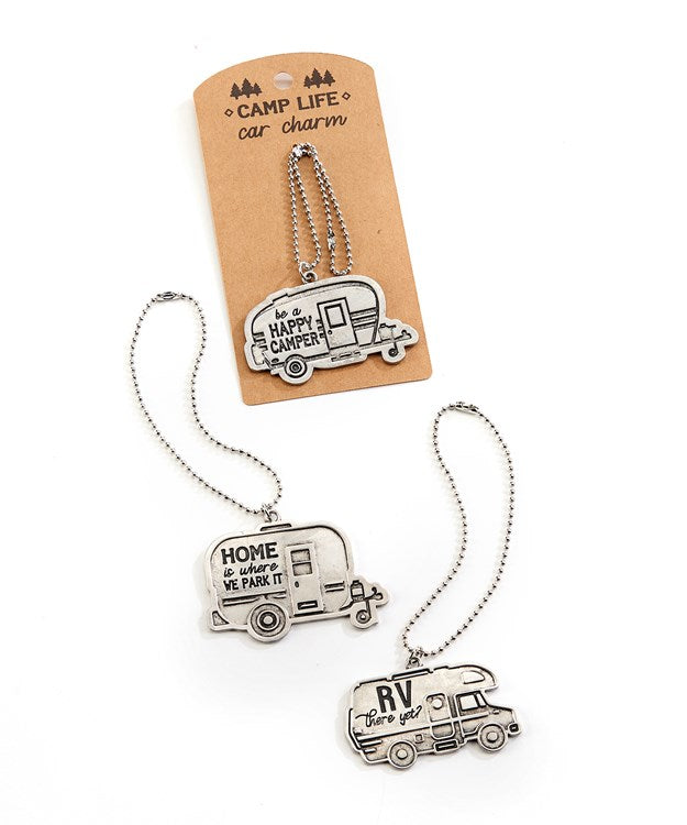 Car charm with a Camp Life sentiment. Available in 3 assorted designs: BE A HAPPY CAMPER, RV THERE YET?, HOME IS WHERE WE PARK IT.
