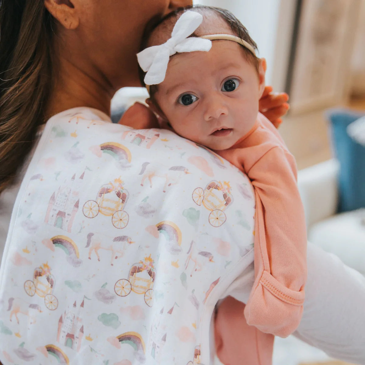 Our burp cloths are created with 100% ultra-soft cotton layers on the front (patterned) and back. You can feel confident that baby will feel cozy against your shoulder while burping.