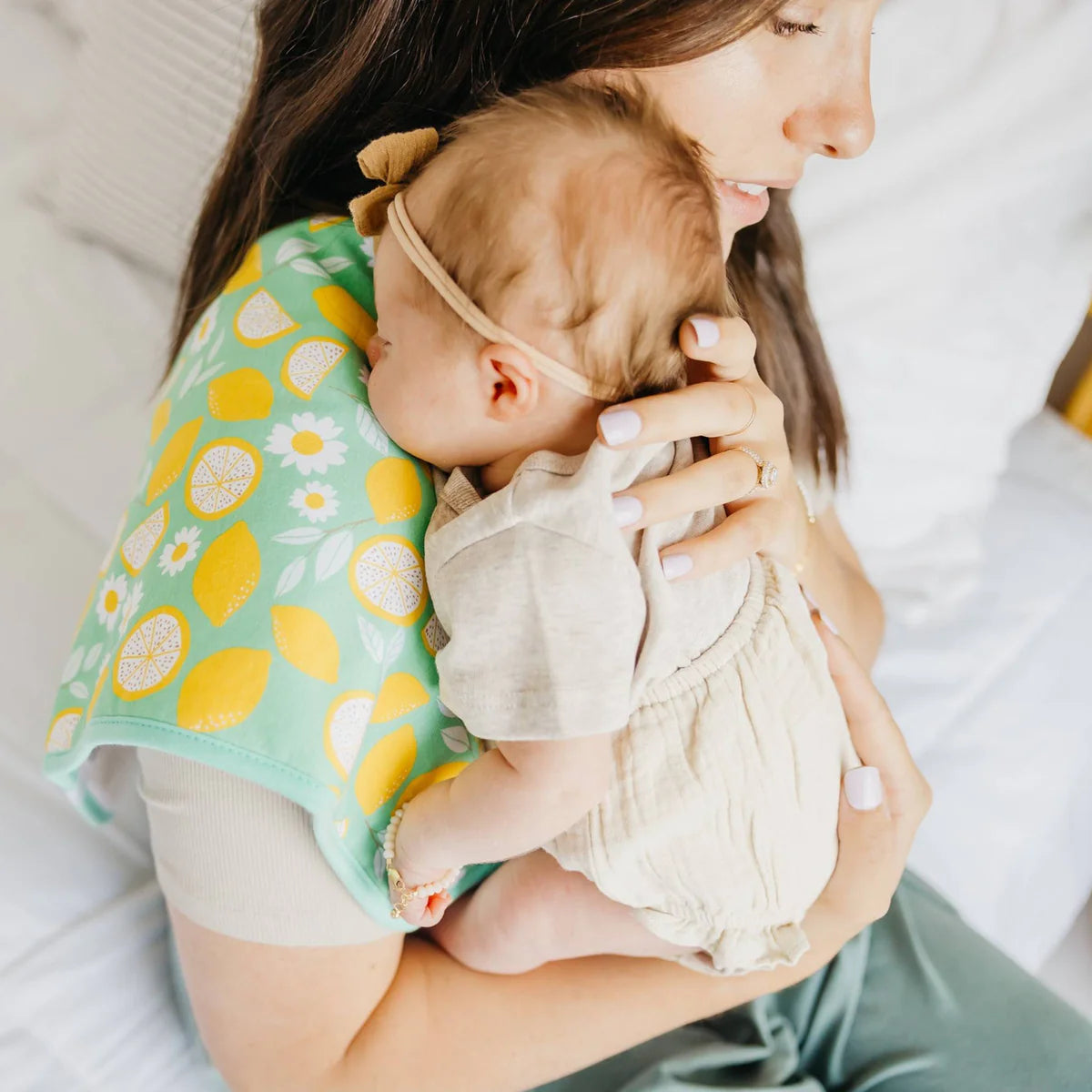 Our burp cloths are created with 100% ultra-soft cotton layers on the front (patterned) and back. You can feel confident that baby will feel cozy against your shoulder while burping.