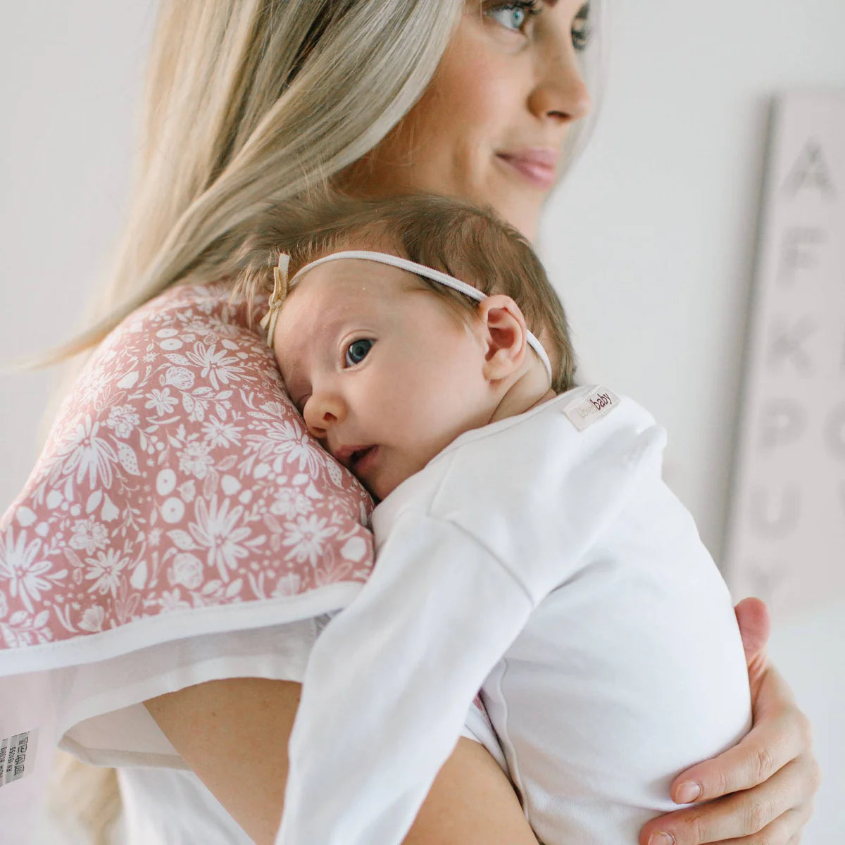 Our burp cloths are created with 100% ultra-soft cotton layers on the front (patterned) and back. You can feel confident that baby will feel cozy against your shoulder while burping.