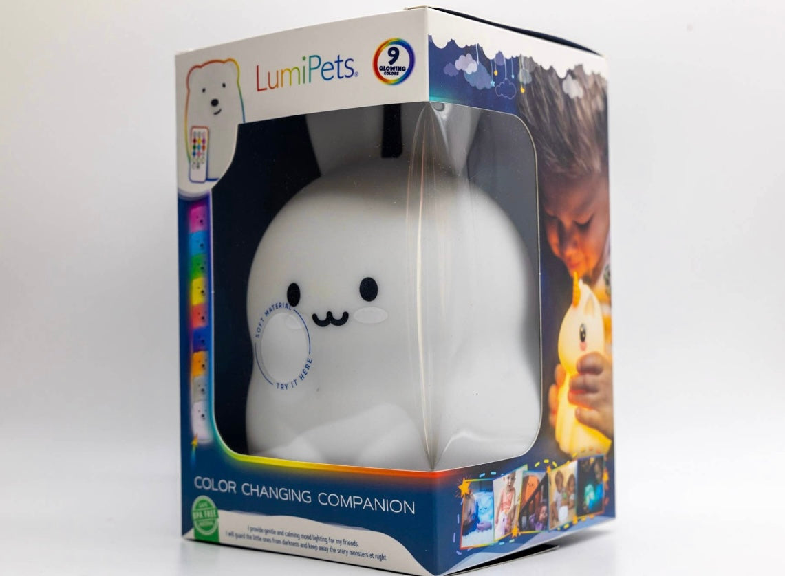 Soothing slow fade option • 3 sleep timer settings • Auto-shut off• Machine washable soft silicon • BPA Free safe for children • Perfect kids night light, nursery night light, baby night light. Product size 6" × 5"× 5". Includes Lumipet®, remote and USB cord.