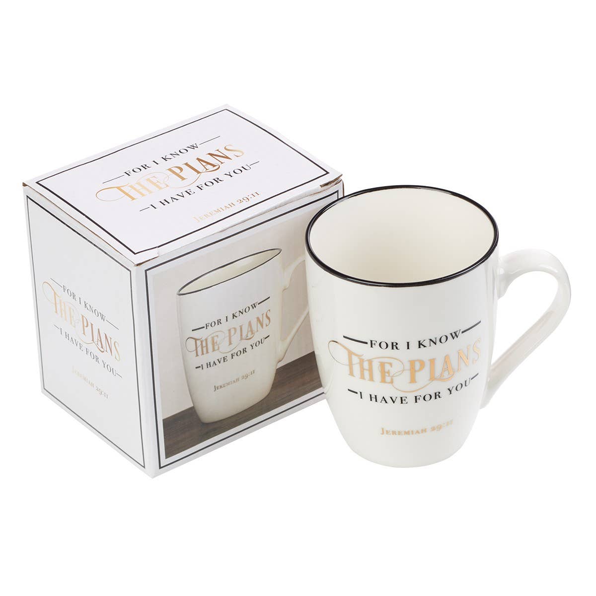 The white I Know The Plans Ceramic Coffee Mug shares a hopeful message about your future - God has already planned it. The white ceramic mug features a key portion of Jeremiah 29:1For I know the plans I have for youon the front of the mug. The text is printed in black and partially gold foiled. The delicate nature of the gold foil makes it unsuitable for a microwave or dishwasher. We recommend handwashing the mug to maintain its beauty. A coordinating black stripe around the rim of the mug finishes off the design. The mug holds 12 fluid ounces and is the perfect height for personal use coffee brewing systems. The mug arrives in a packaged gift box, making this a cherished gift for any occasion. Wrap this mug to thank a nurse or a teacher for their help, or send one off to college with a new student. The message on the I Know The Plans Ceramic Coffee Mug