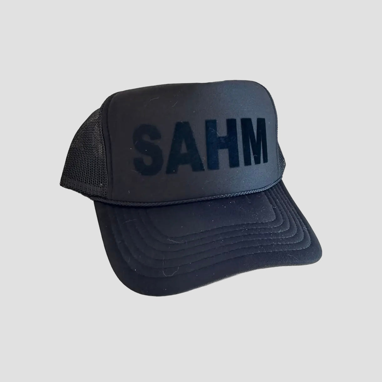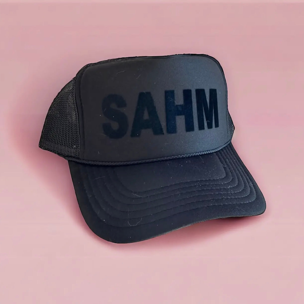 Super cute 'SAHM' (Stay At Home Mom) in black velvet vinyl on black trucker hat! This trucker hat is a unisex fit.