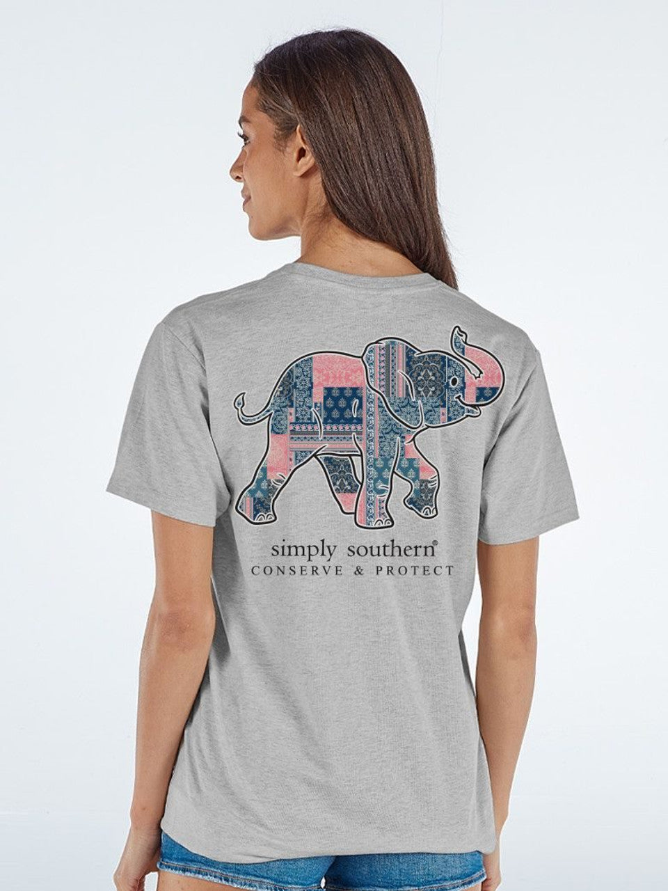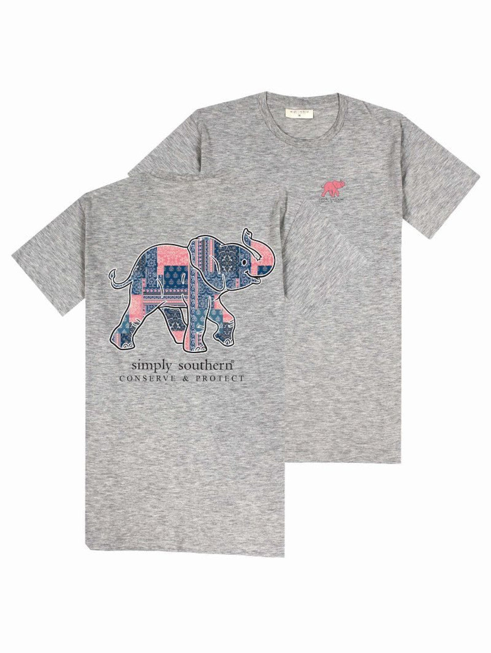 Light heather grey short sleeve shirt with the silhouette of an elephant filled with vintage quilted patches. Simply Southern logo below and on left chest. 100% cotton. Unisex sizing. Elephant tracker.