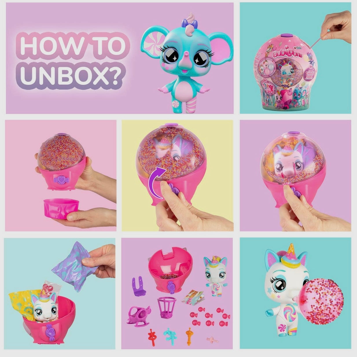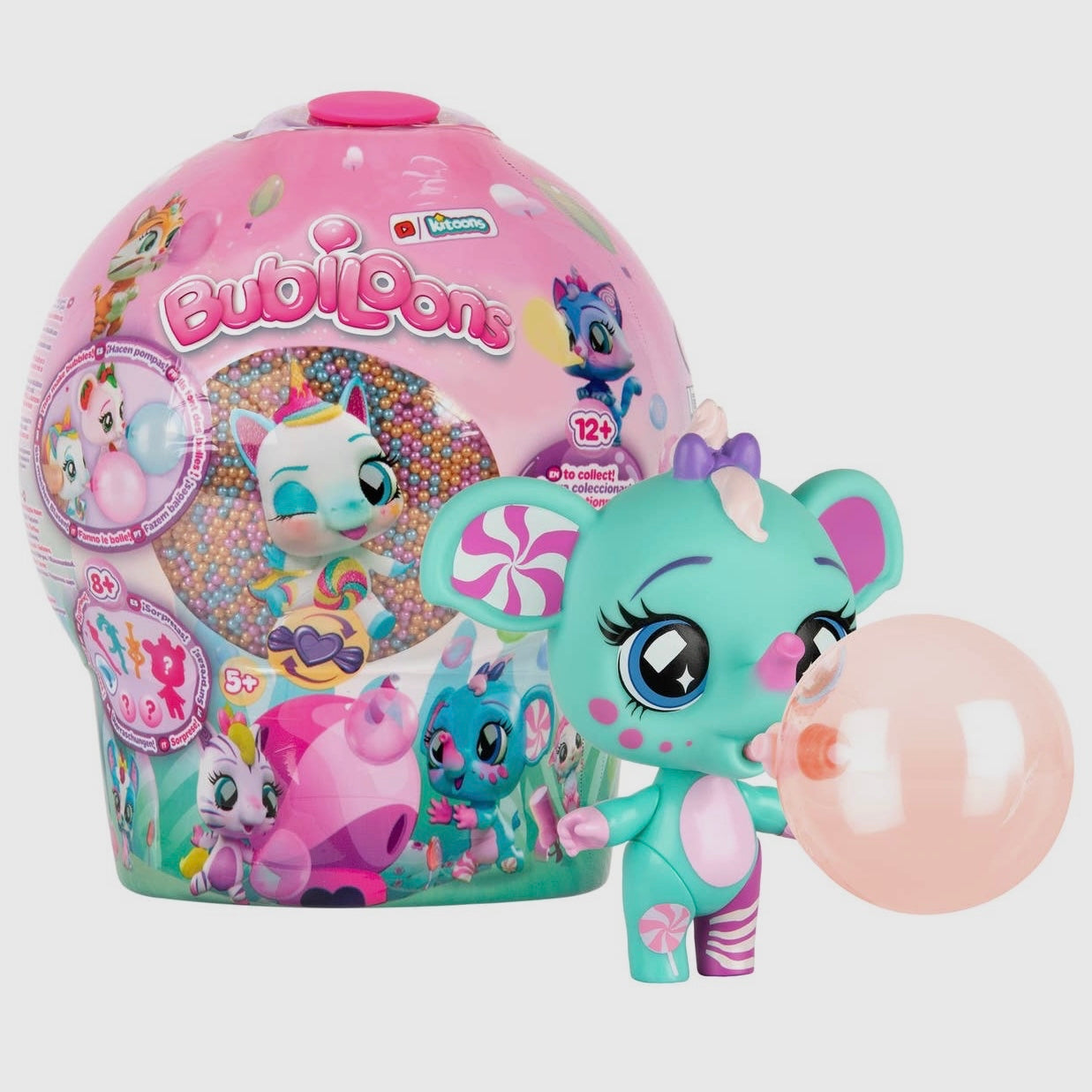 Bubiloons are a collection of animals who live in a world full of bubbles, colors, and candy. Plus they can make bubbles with their mouths. When you spin the candy shaped dial on the capsule, the colorful beads will start to fall and unveil the surprise Bubiloons animal inside!
