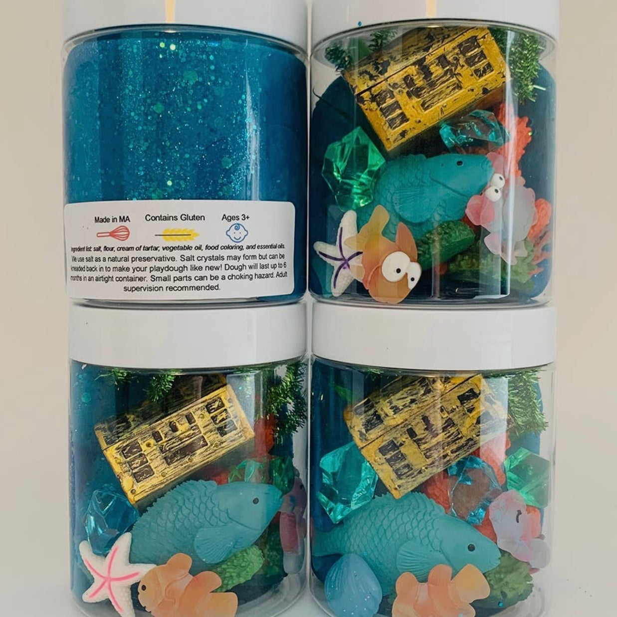 Includes 6oz of homemade all natural scented blue glitter swirled playdough with themed items such as a treasure chest, sea creatures, gems, chenille stem, and ocean plants. Perfect for on-the-go or travel.
