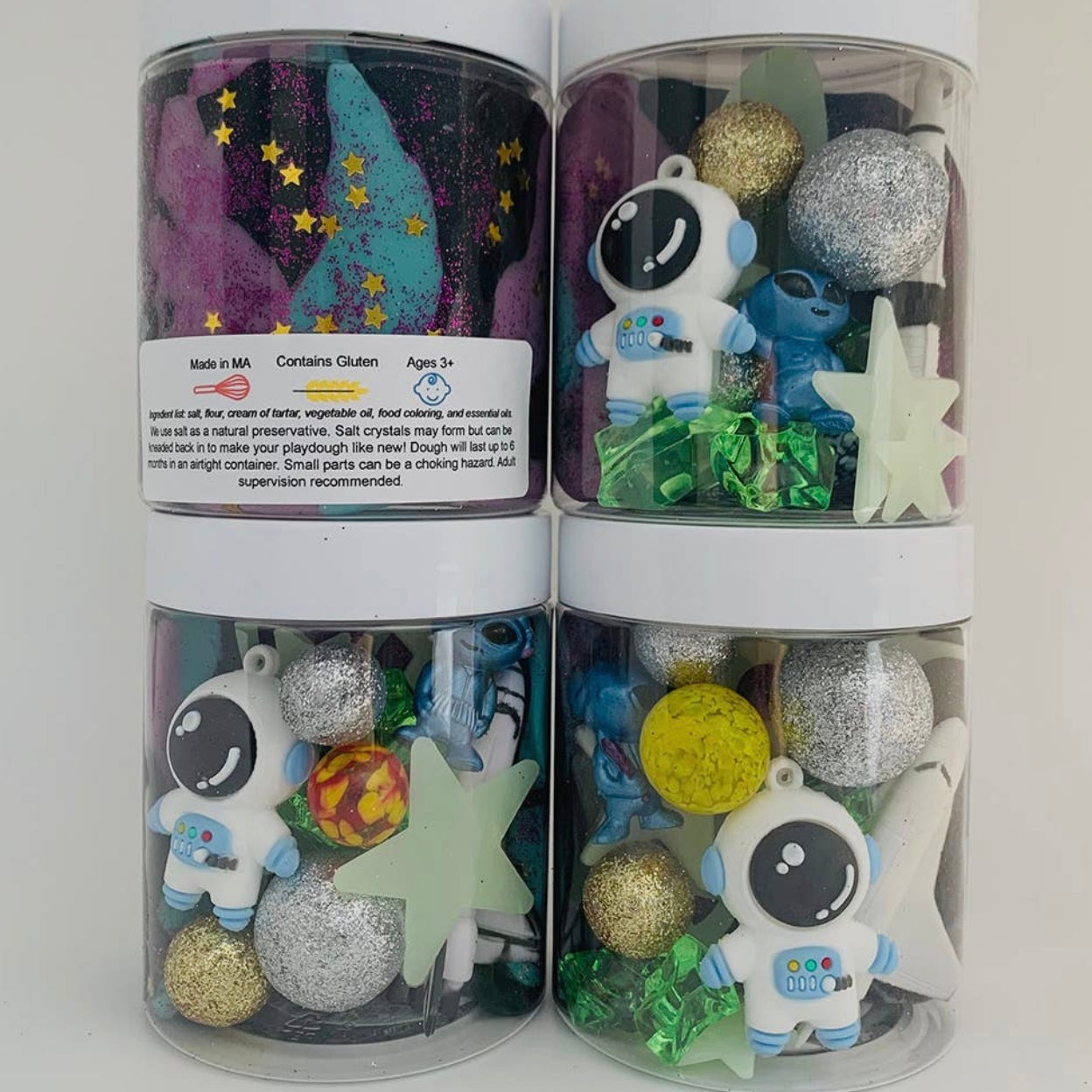 Explore the vast beyond of space with this 8oz space inspired go jar. Includes 6oz of homemade all natural galaxy glitter playdough with themed items such as an astronaut figurine, space shuttle, alien, glittered foam balls, green gems, colored marbles, and glow and the dark stars. Perfect for on-the-go or travel.