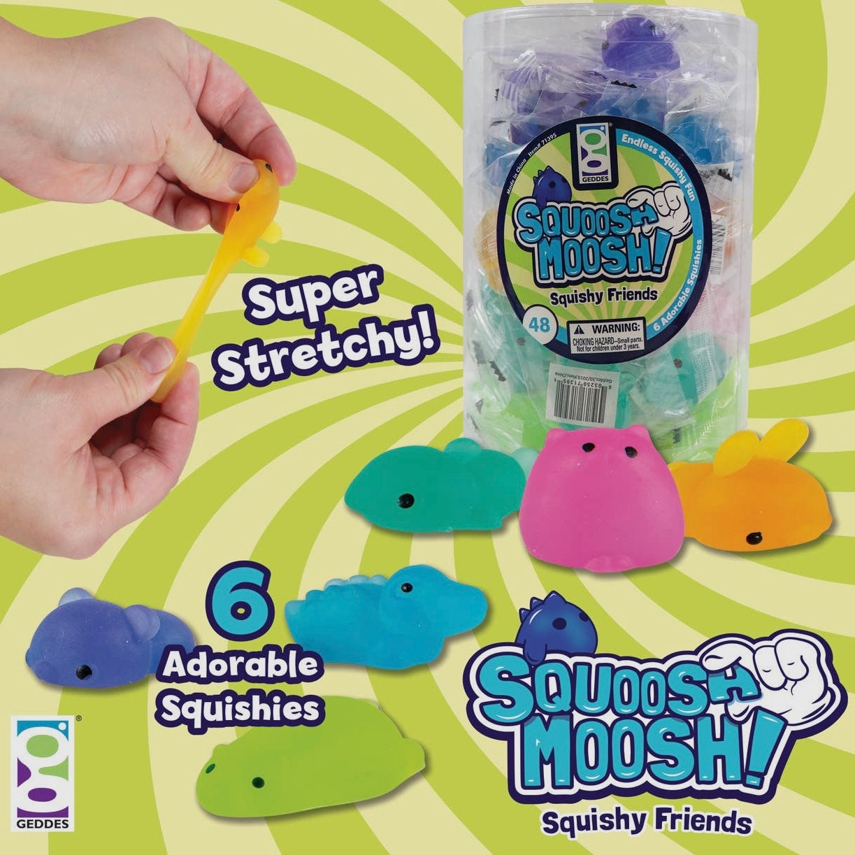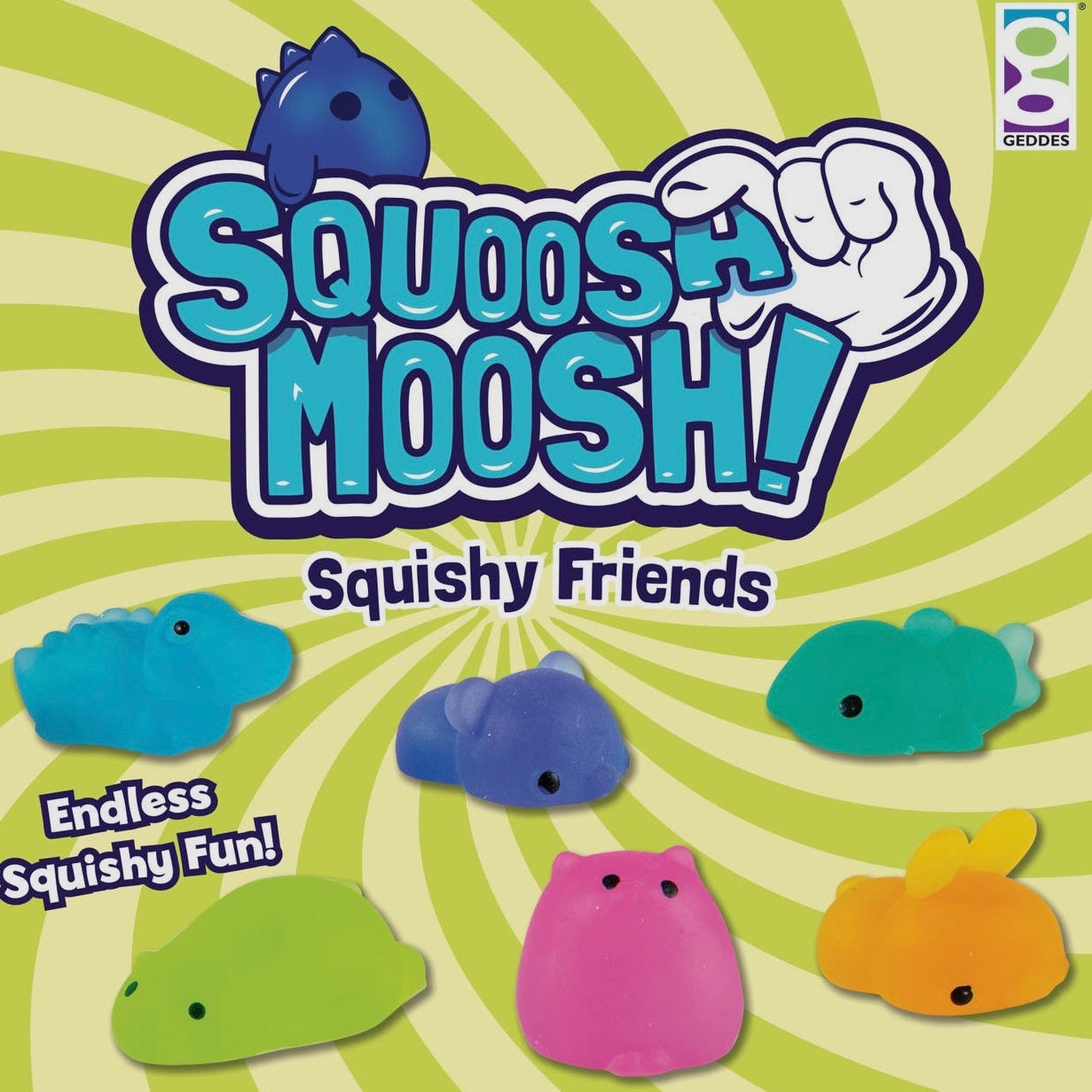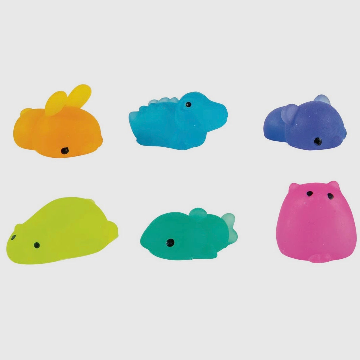 Mini in size, BIG on squeeze. These cute animals provide endless squishy fun! 6 animals: cat (pink), polar bear (green), bunny (orange), dino (blue), shark (teal), and bear (purple). Use soap and water to clean!
