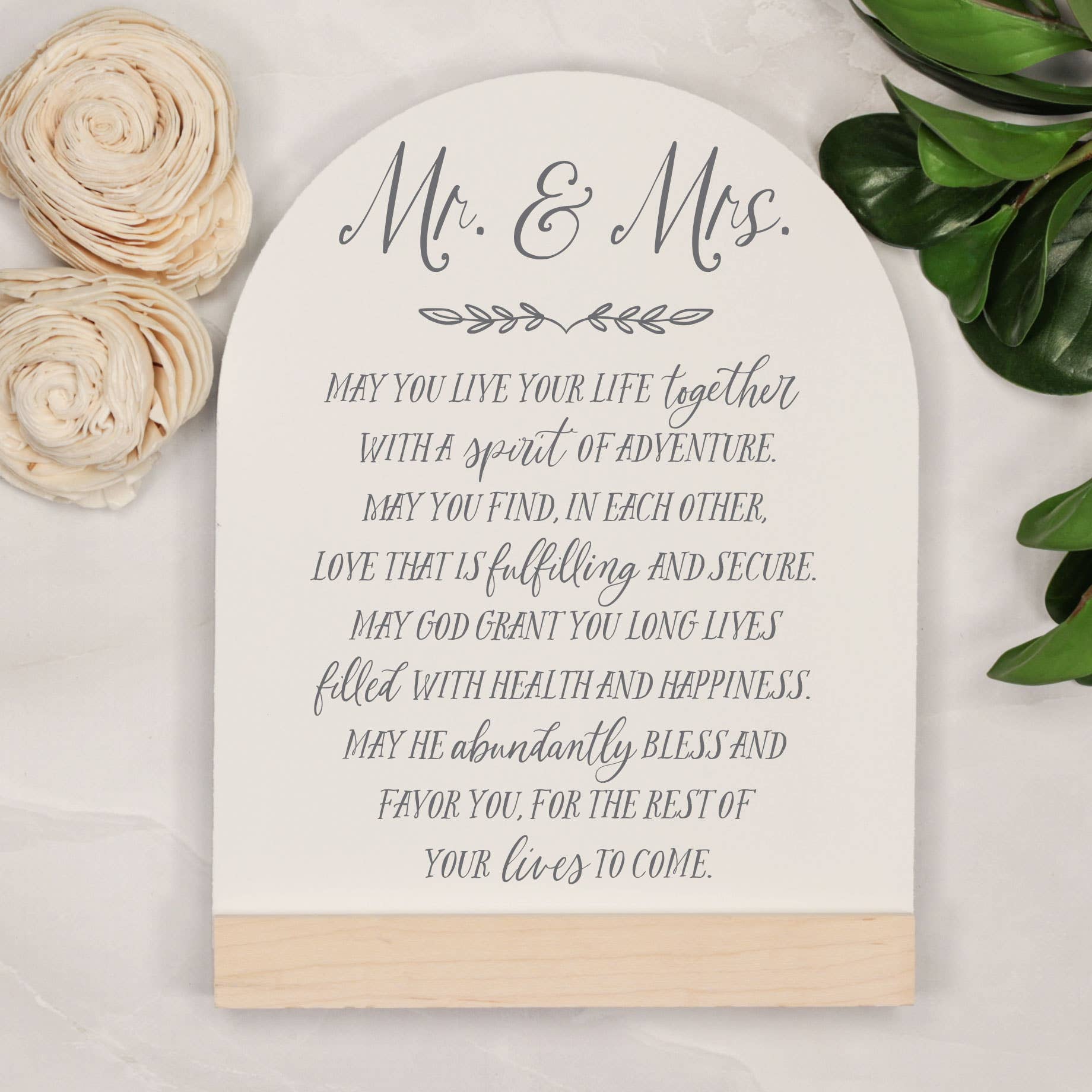 Mr & Mrs (May Your Lives) This Arch Shaped Desk Sign is 8x10 inches and perfect for adding a personalized touch to any workspace. It's made from high-quality, durable materials that are sure to last for years. This desk sign also features a modern design that adds a contemporary touch to any room. It's lightweight and easy to hang up wherever you choose, making it an ideal way to show off your unique style in any home or office. Whether you're looking for the perfect gift or something special for yourself, this desk sign is sure to please!