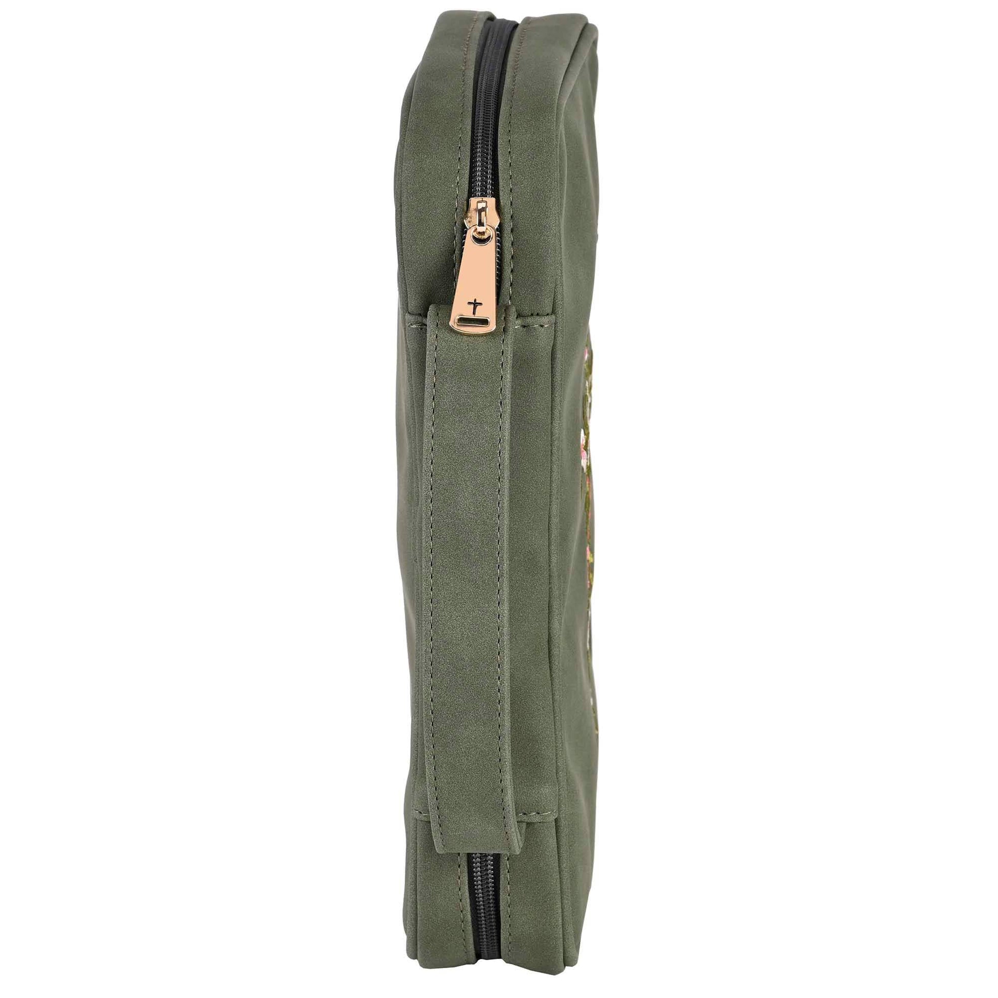 Olive-Green Polyurethane Soft-Body Suede-Feel Bible Cover Displays A Floral Embroidered Cross On The Front, With An Open Back Pocket. Features A Cross Zipper Pull, Lay-Flat Construction, A Non-Rusting Self-Repairing Zipper Pull, Nylon Reinforced Stitching And A Ribbon Bookmark. Also Has A Carrying Handle On The Spine. Approximate Extra-Large-Size Dimensions 10-1/4 X 2 X 7-1/4. White Dove design.
