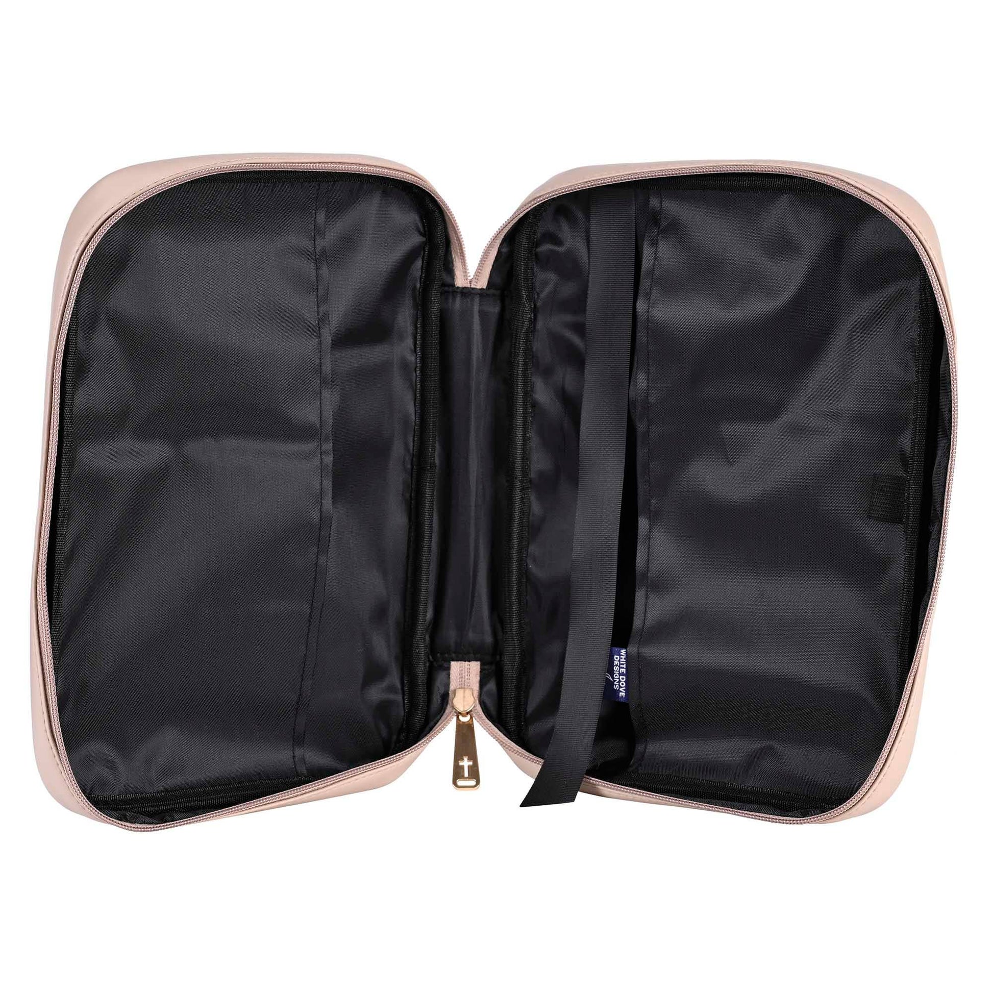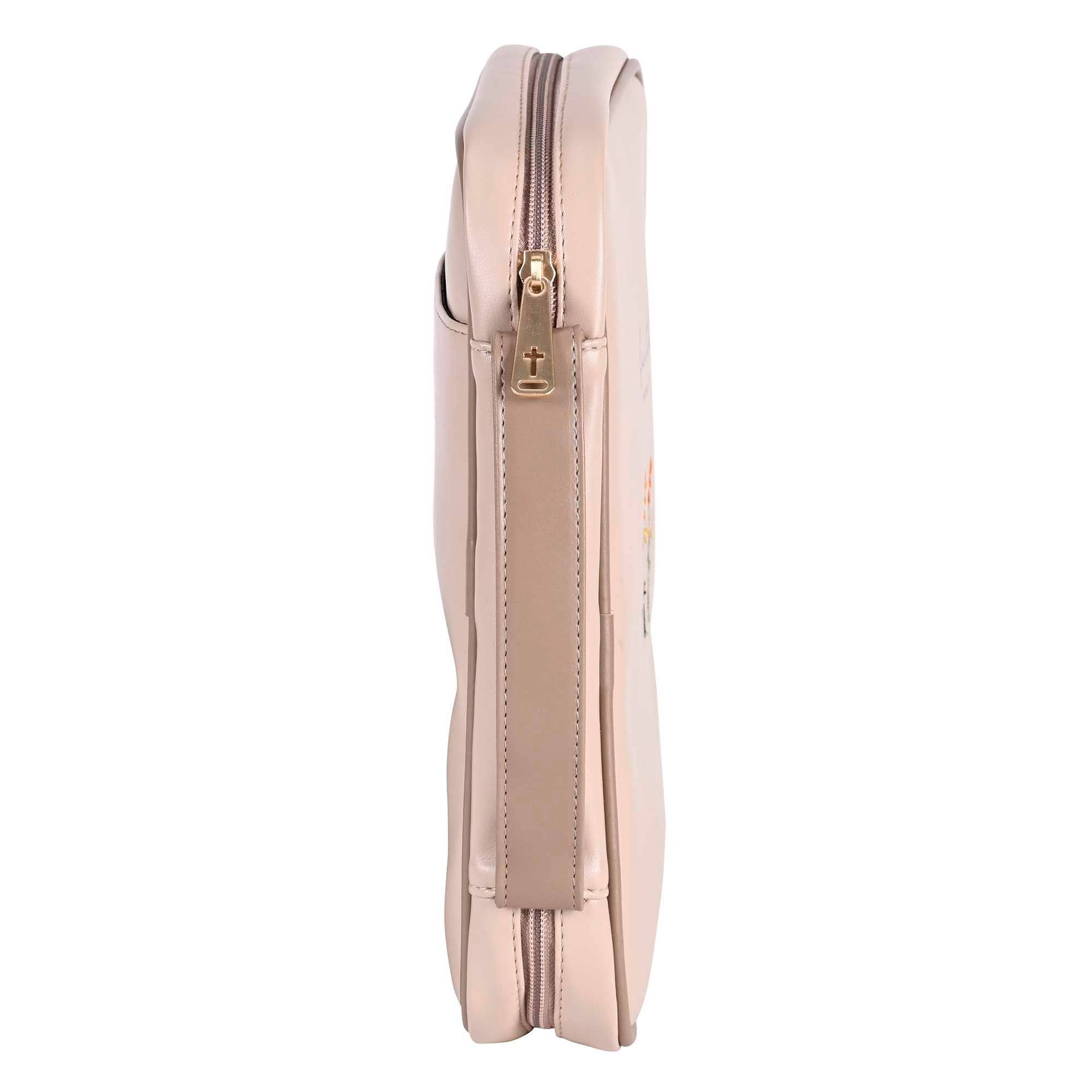 Soft body style polyurethane Bible cover with embroidered flowers; includes rear pocket; also inside is a bookmark & elastic pen loop with cut thru Cross zipper pull; side handle, non-rusting self-repairing zipper, nylon reinforced stitching, XL dimensions: 7-1/4 x 2 x 10-1/4. Features the word faith and reference to Hebrews 11:1. White Dove design